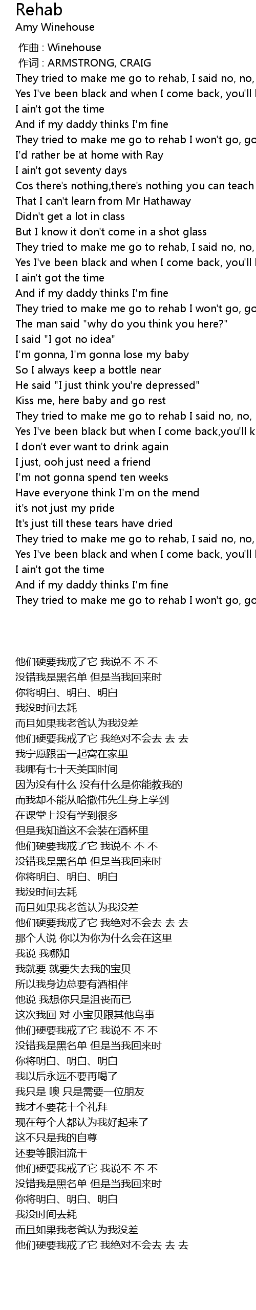 This is lyrics to Rehab by Rihanna. I do not own the music.. Rehab Lyrics are a theme that is being searched for and favored by netizens nowadays. You can Save the Rehab Lyrics here. Get all royalty-free pix. Amy Winehouse - Rehab (LYRICS ON SCREEN), Singer Amy Winehouse has been found dead at her home in Camden, north London, at the age of 27, police have confirmed..